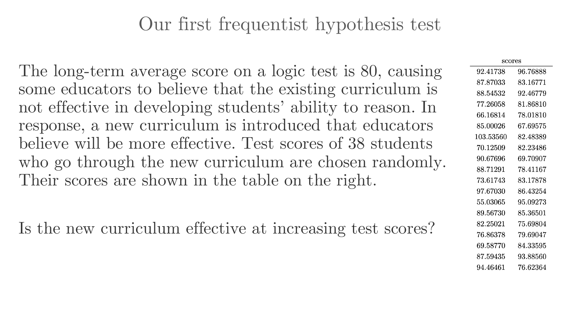 Let’s begin with a concrete problem that will guide our exploration of hypothesis testing. Suppose we’re trying to improve the logical ability of students through a new curriculum. The old curriculum, which has been in use for many years, produces an average test score of 80 points. We’ve developed a new curriculum and trained a large group of students using this approach.