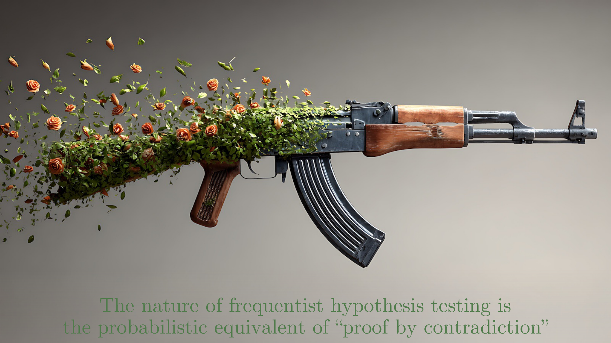 Frequentist hypothesis testing operates on a principle analogous to proof by contradiction in mathematics. We temporarily assume the opposite of what we hope to demonstrate, then show that this assumption leads to implausible results.