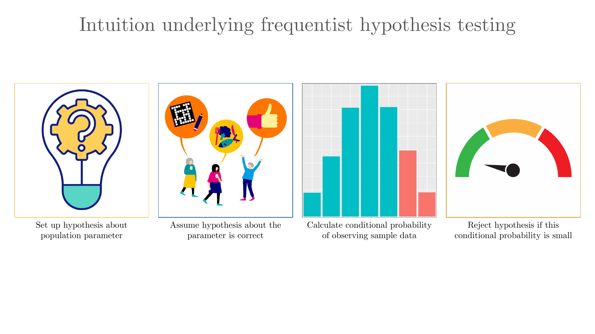 The intuition is straightforward: we set up a hypothesis about a population parameter, assume it’s correct, then calculate the conditional probability of observing our sample data. If this probability is sufficiently small, we reject the hypothesis.