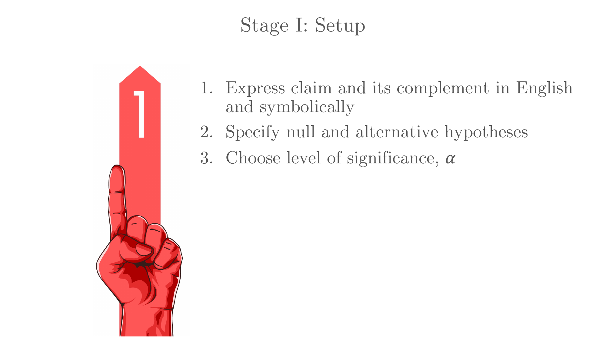 Stage 1: Set Up 1. State the null and alternative hypotheses 2. Choose a significance level α 3. Identify the test type (one-sided or two-sided)