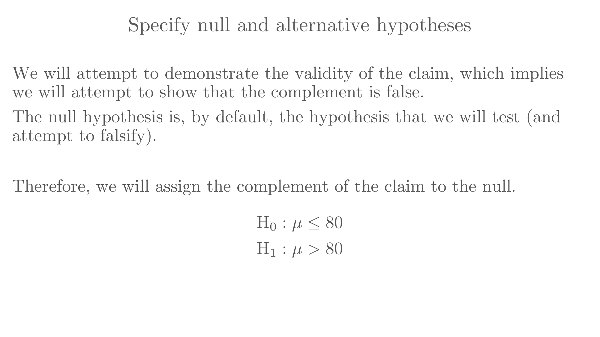 Under the null hypothesis, we assume \(\mu \leq 80\). For the purposes of constructing our test, we’ll use \(\mu = 80\) as the boundary value (the null hypothesis “at its most extreme”).