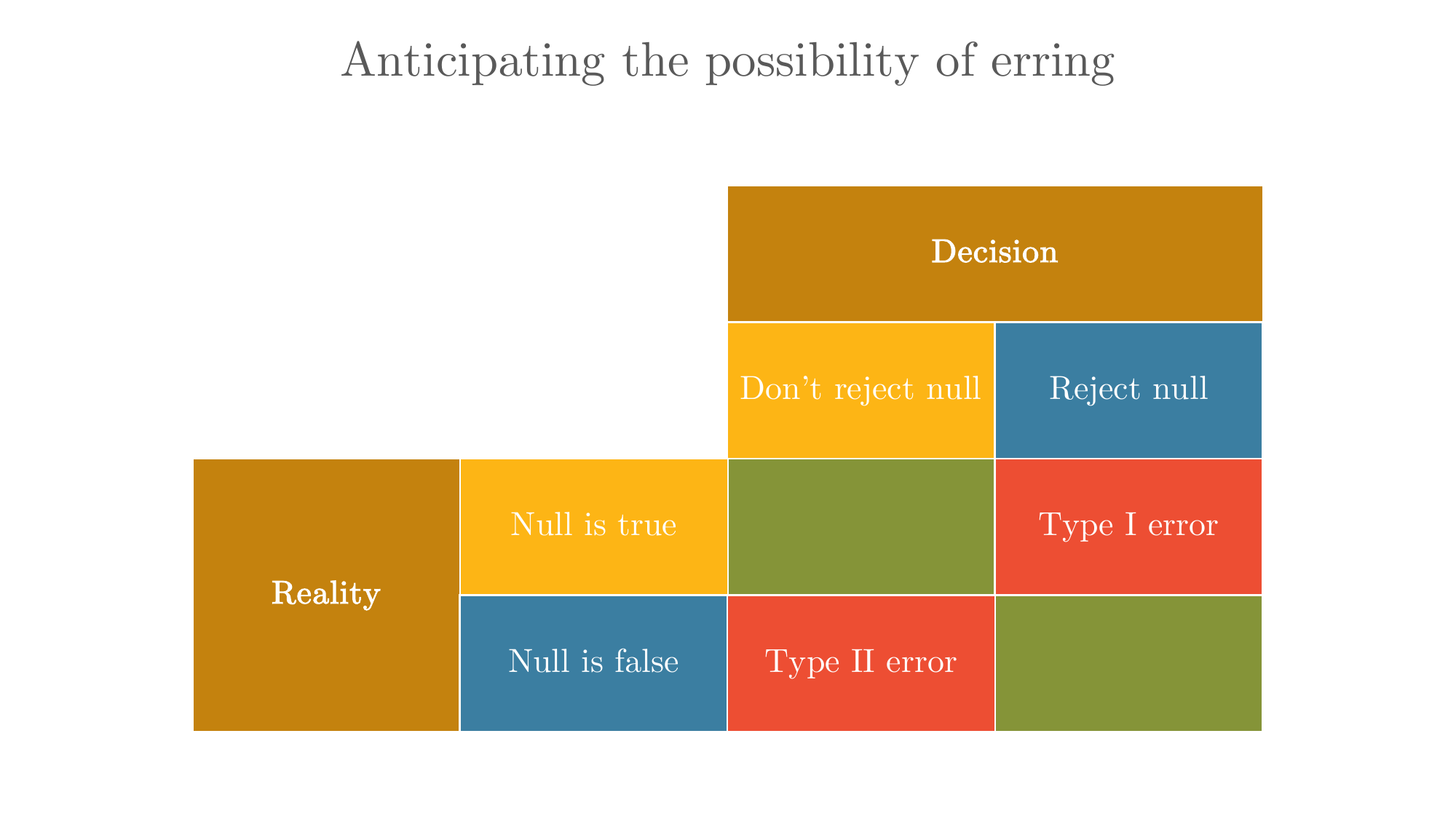 Before proceeding, we must acknowledge that hypothesis testing involves the possibility of error. There are two types of errors we might make: